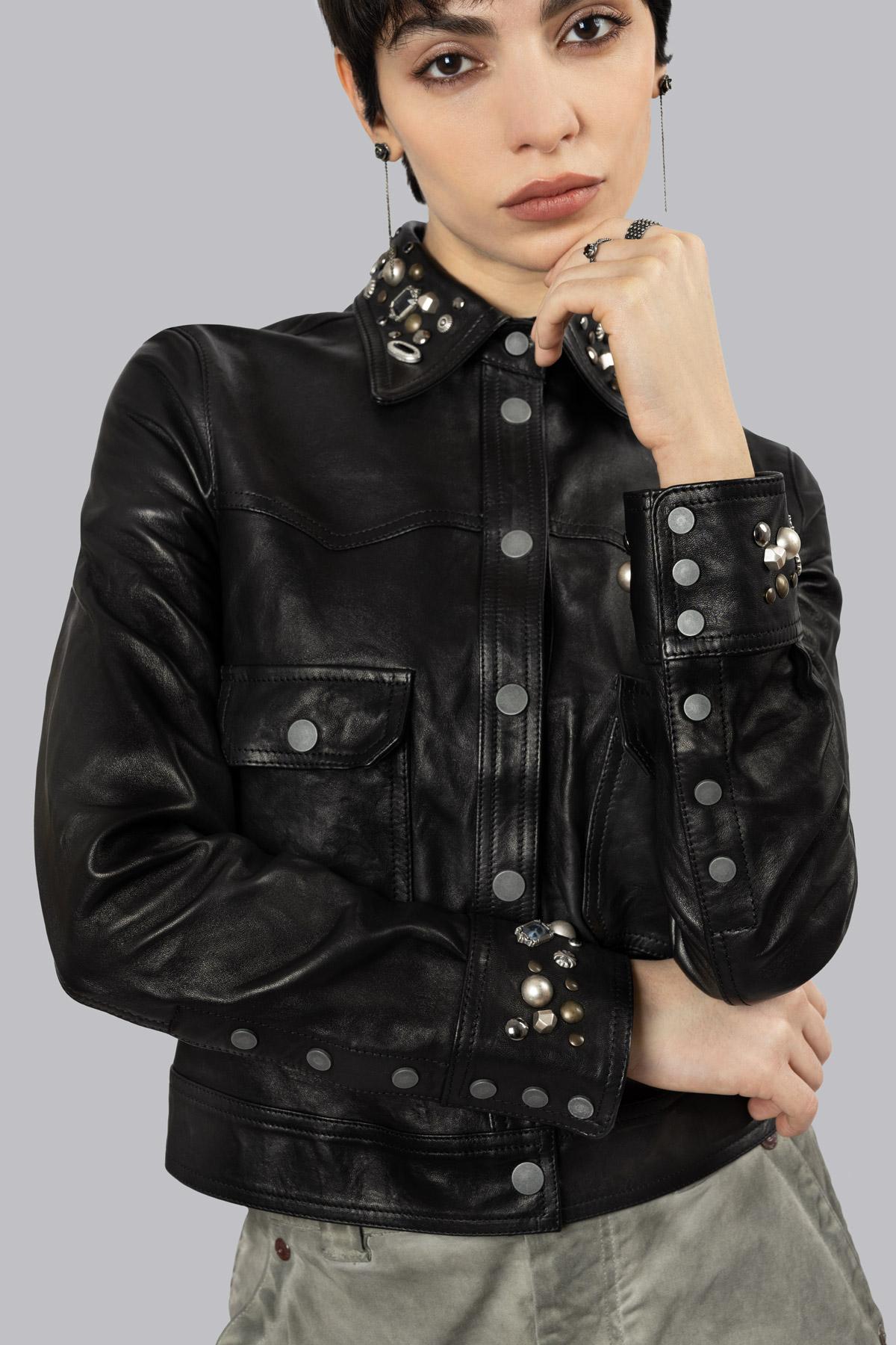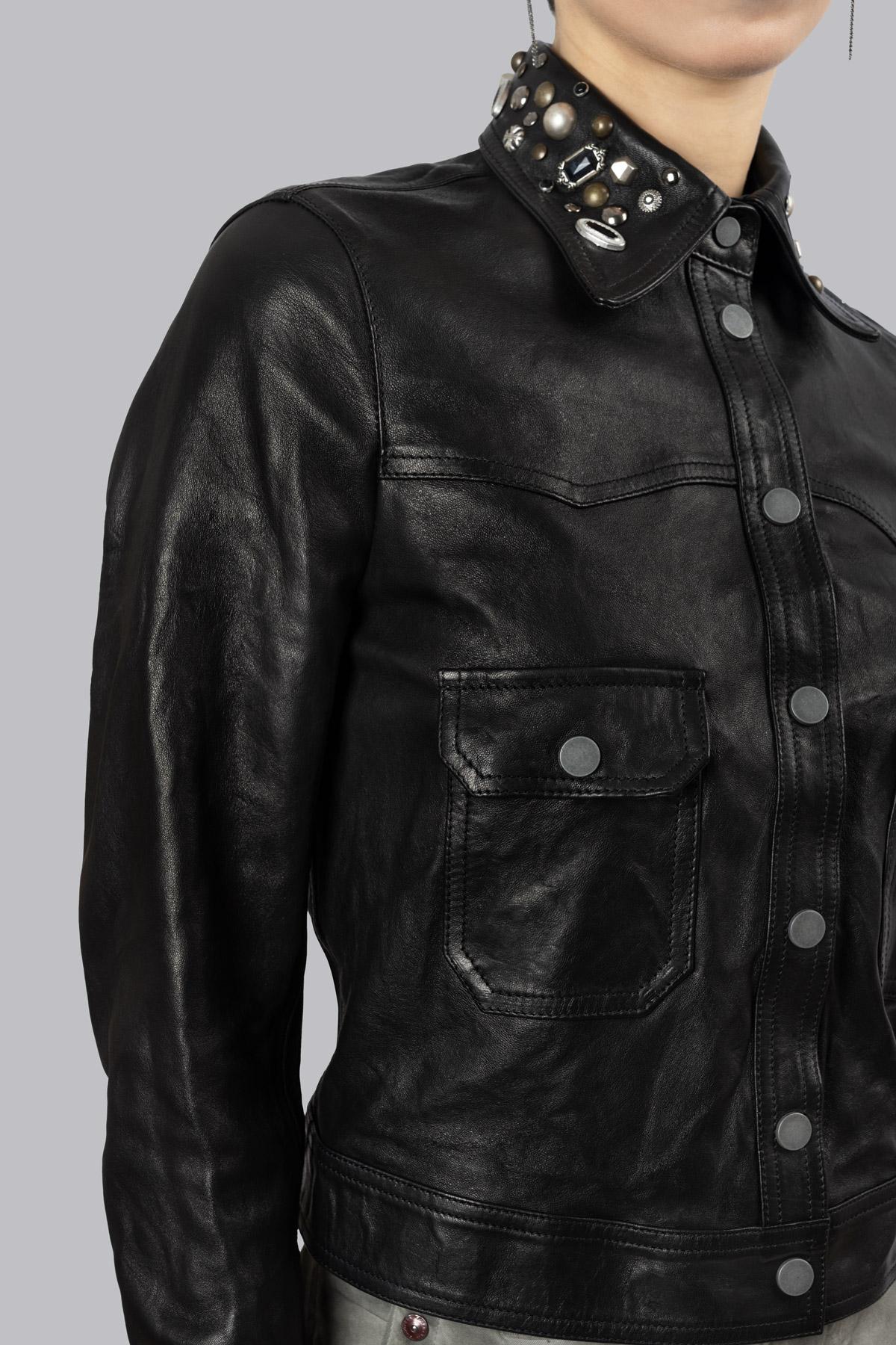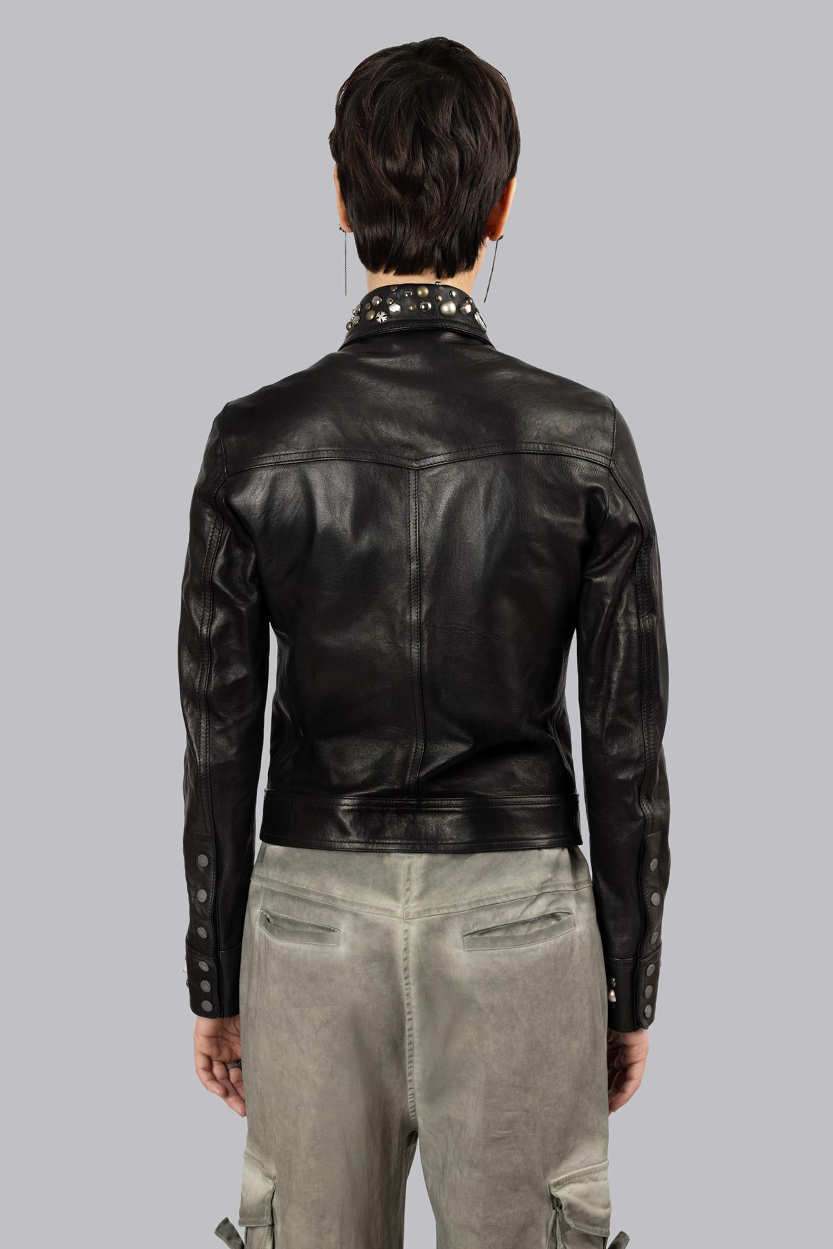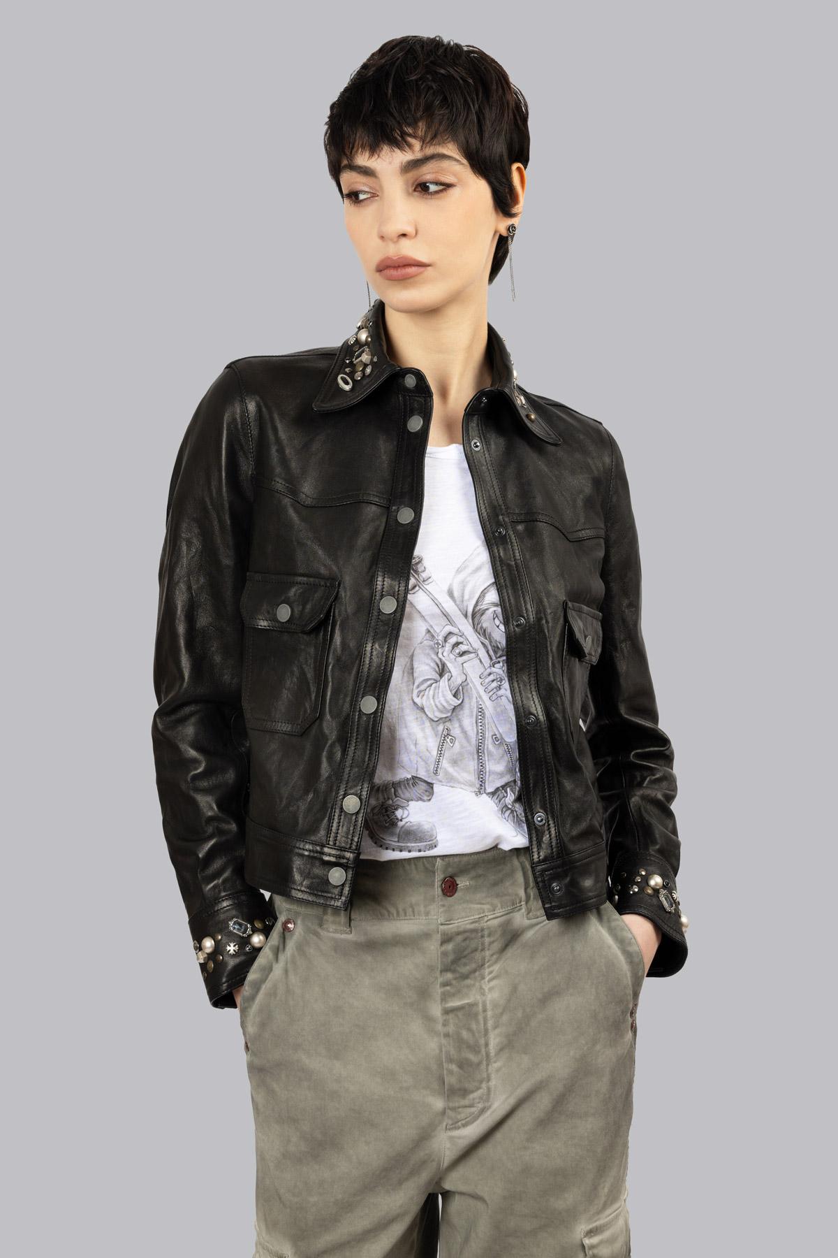 Unlined leather jacket embellished with spinel stone details and studs on the collar and cuffs, central snap button closure and patch pockets. Inside, the iconic skull an ...