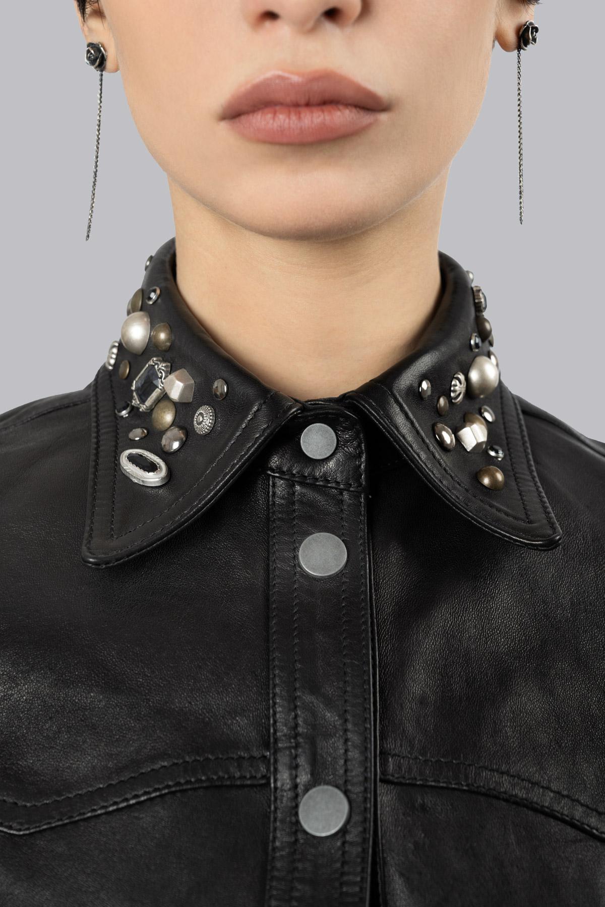 Unlined leather jacket embellished with spinel stone details and studs on the collar and cuffs, central snap button closure and patch pockets. Inside, the iconic skull and rose print.