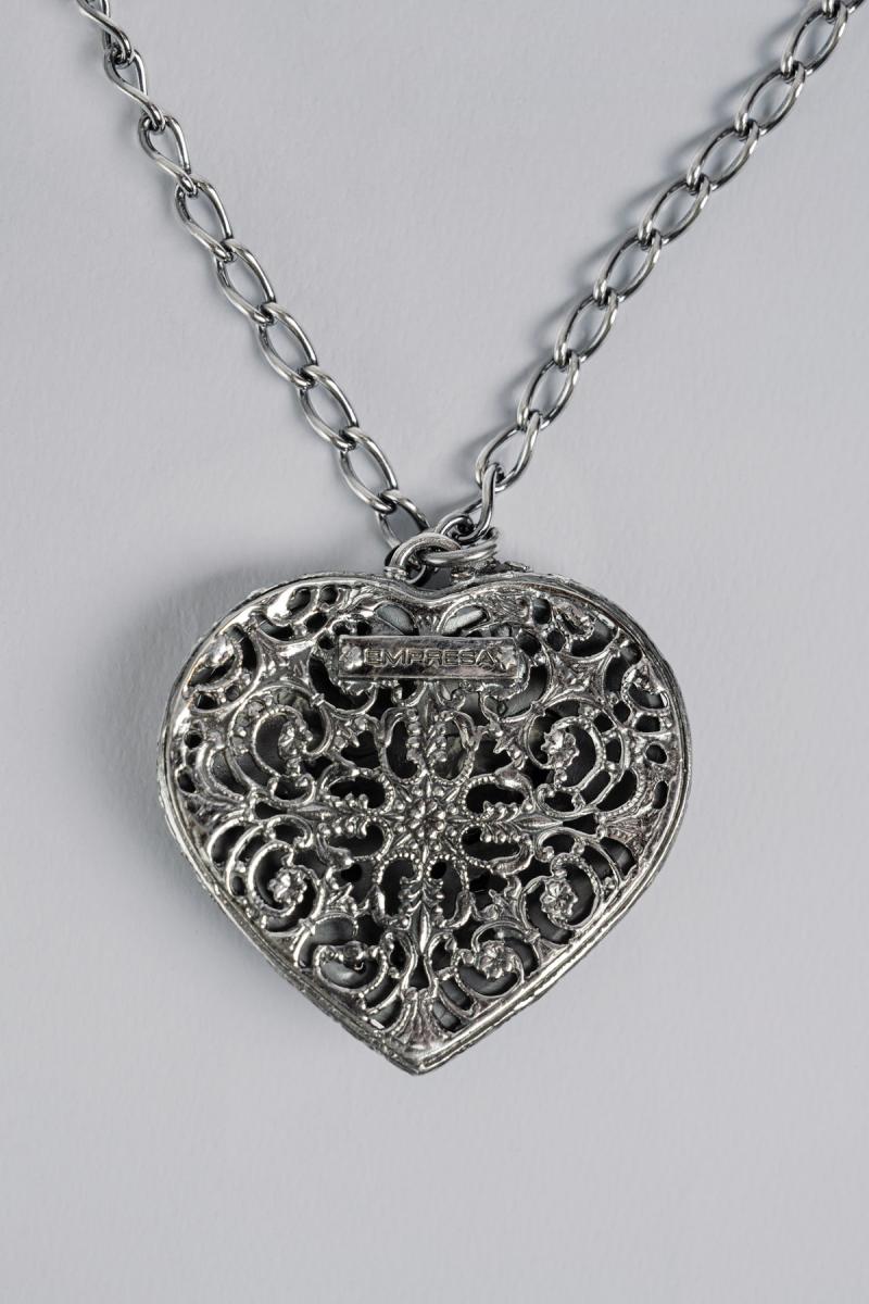 Necklace with heart-shaped pendant, embellished with two finely sculpted skulls and sparkling stones. Clasp with lobster clasp.