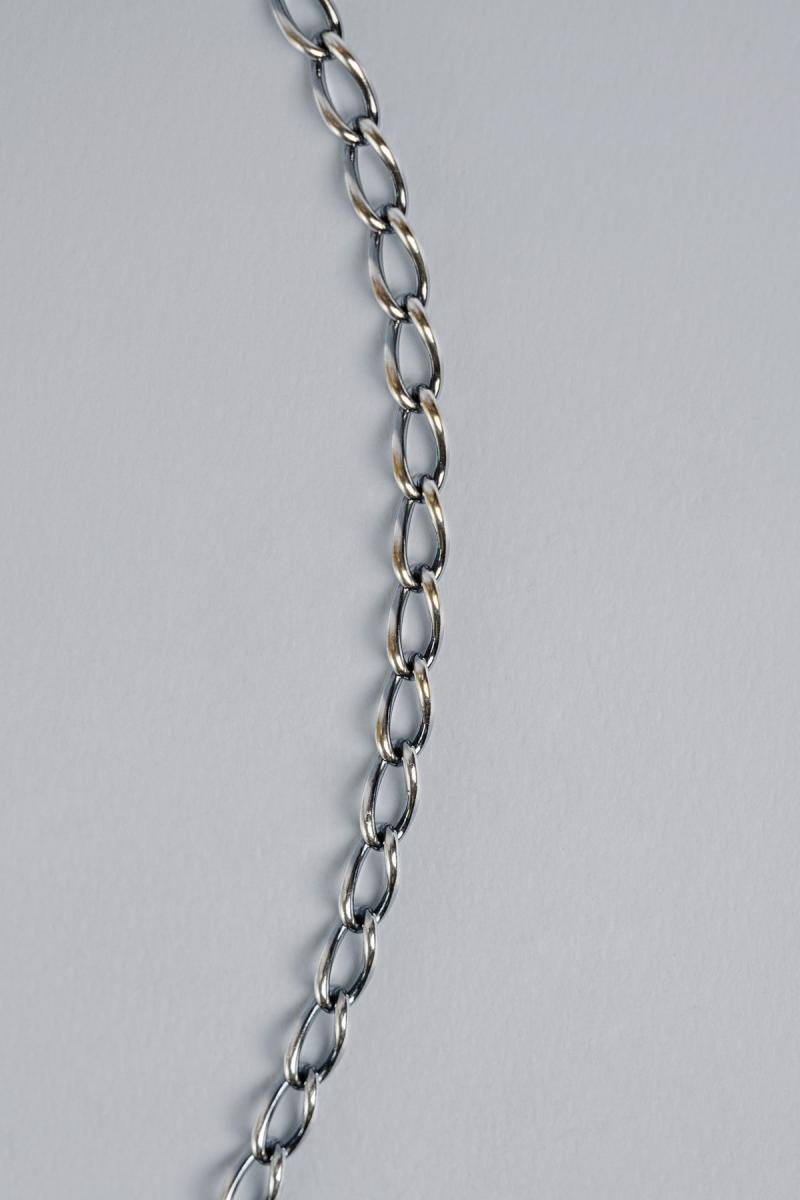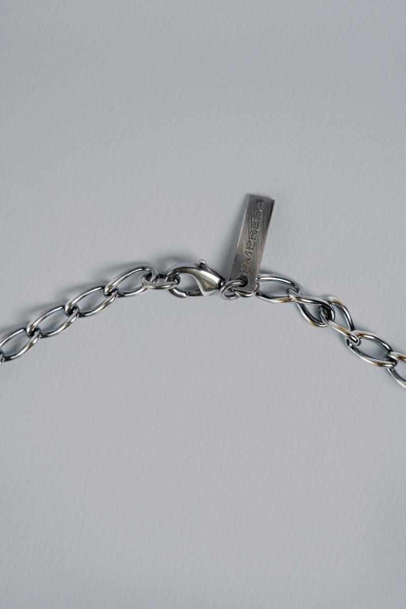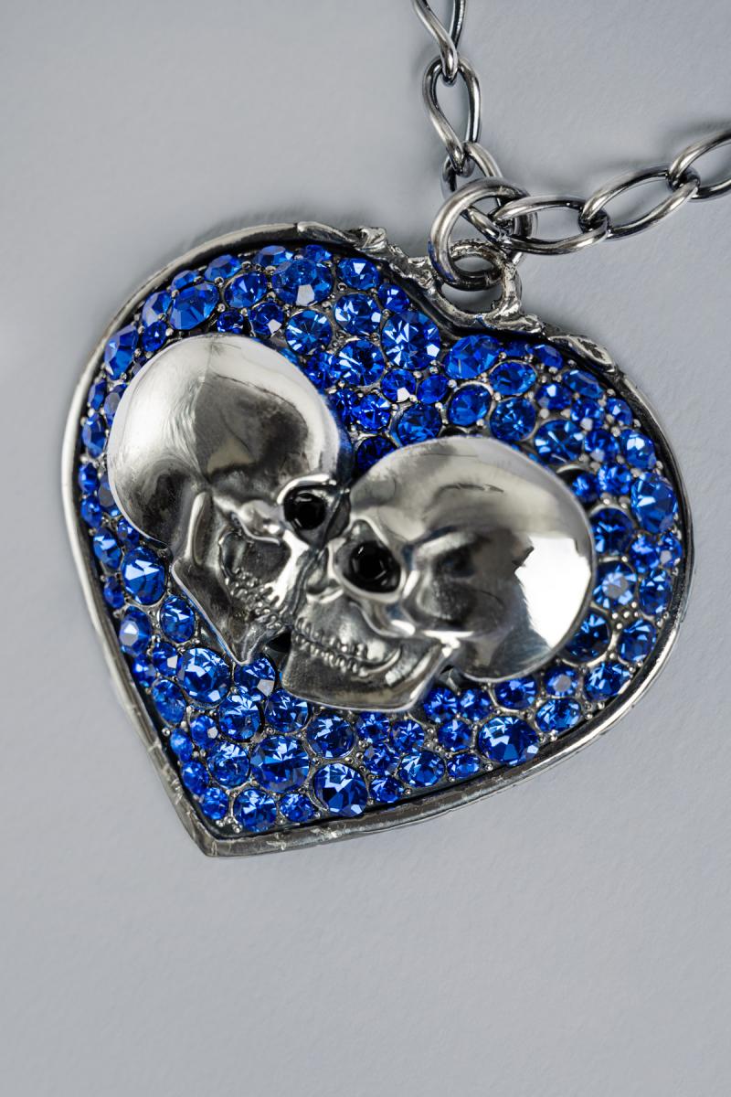 Necklace with heart-shaped pendant, embellished with two finely sculpted skulls and sparkling stones. Clasp with lobster clasp.